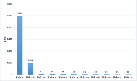 施設ごとのダイオキシン類濃度・排ガス量等から、全国の一般廃棄物焼却施設からの排出量を推計した。下図のように、ダイオキシン類の排出量は平成9年度より激減しており、平成25年度のダイオキシン類の排出量推計結果は30g-TEQ/年であった。