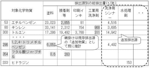 現在のすそ切り以下排出量の推計では、推計対象が「塗料」、「接着剤」等の14排出源に限られる。このため、アンケート調査で得られた「洗浄用シンナー」「水処理剤」等の用途の排出量を活用し、推計可能な排出源の範囲を拡充する方法を提案した。