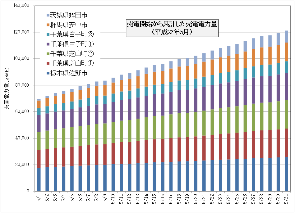 1日ごとの売電電力量は設置場所の増加と共に増加し、平成27年5月の段階では、晴天の日には2,000kWhを超える規模になりました(図1)。それらの売電電力量を累計すると、平成27年5月末までに120,000kWhの規模に到達しました(図2)。